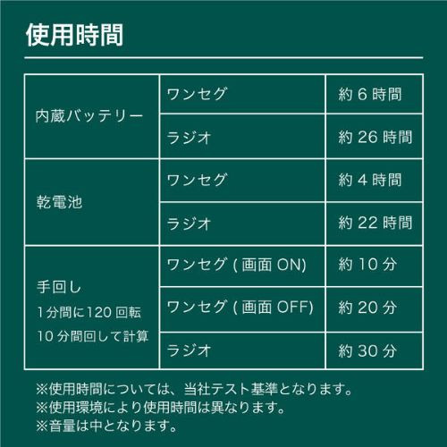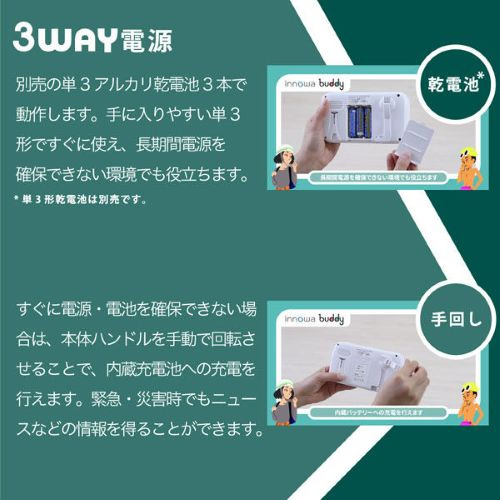 充電池・乾電池・手回しの3つの発電方式から選んで本製品をご利用頂けます。