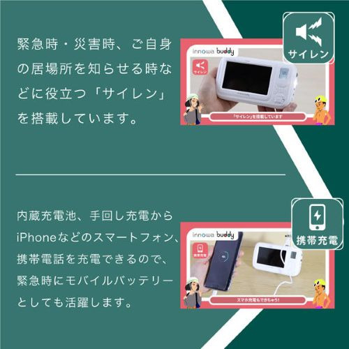 暗い場所でのLEDライトや、災害時に居場所を知らせる際に大きな音を出すサイレン機能も搭載。