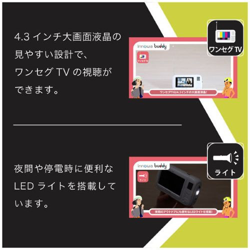 4.3インチの大画面モニターでワンセグTVを楽しめるうえ、ラジオもAM, FM, ワイドFM, 短波全て受信可能です。