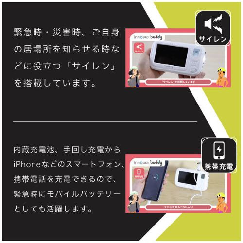暗い場所でのLEDライトや、災害時に居場所を知らせる際に大きな音を出すサイレン機能も搭載。