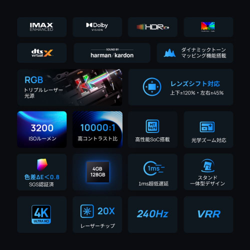 RGB 3色レーザー光源を採用し、3200 ISOルーメンの明るさと10000:1の高コントラストを実現。日差しの入るリビングでも、色鮮やかで立体感のある映像をお楽しみいただけます。