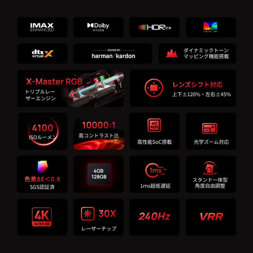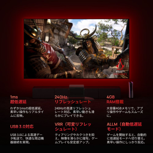 最大300インチの迫力映像、1msの瞬時応答、240Hzの滑らかさ。HGiG、VRR、ALLMでHDR描写も遅延も妥協なし。大画面でのプレイが、もうテレビには戻れないほど快適に。