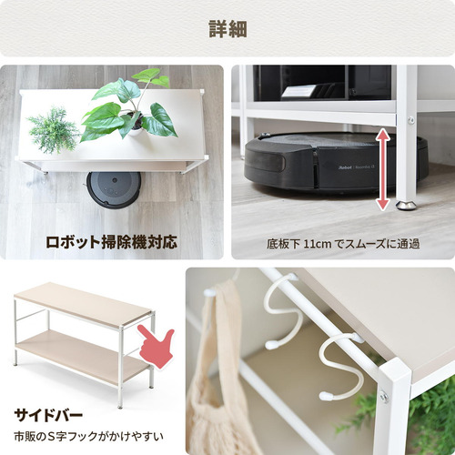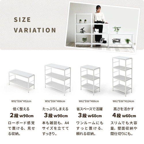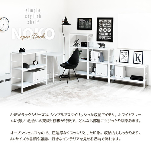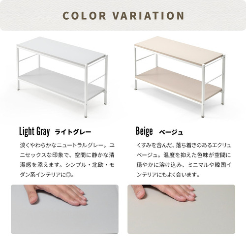 ホワイトフレームに柔らかいニュアンスカラーの天板、棚板が特徴的