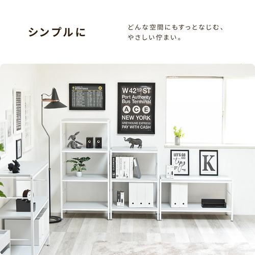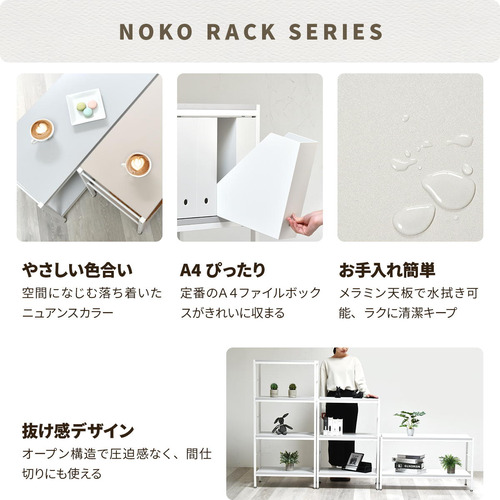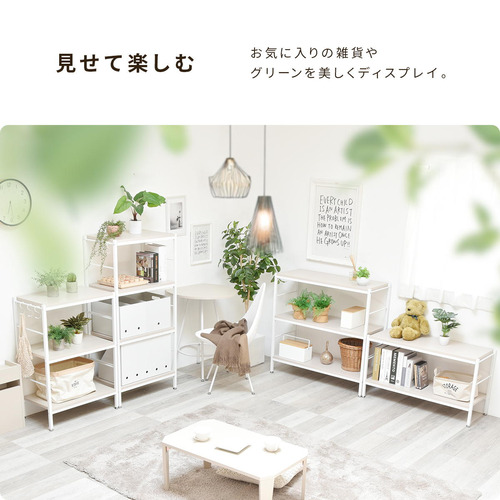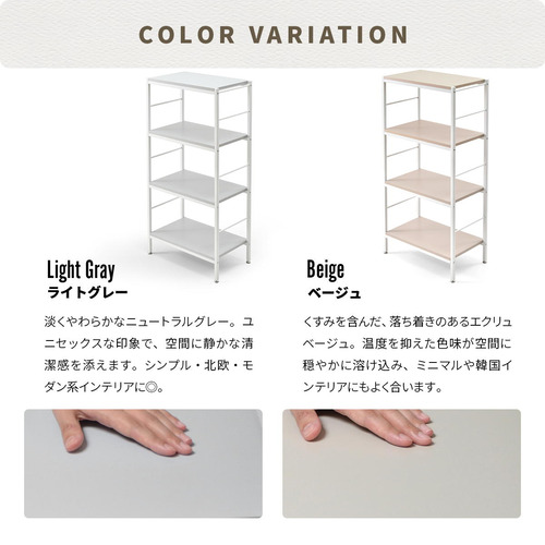 ホワイトフレームに柔らかいニュアンスカラーの天板、棚板が特徴的