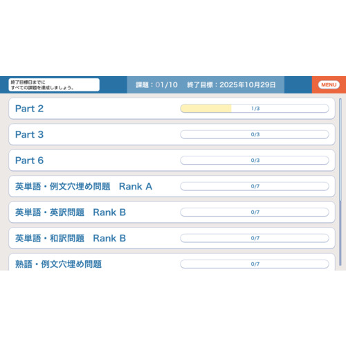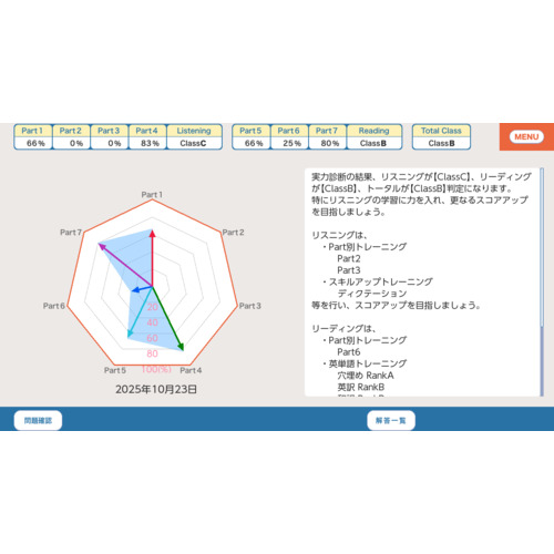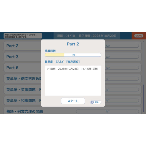 本番さながらの形式でチャレンジする「模擬試験」や苦手なPartのみ復習する「Part別トレーニング」、