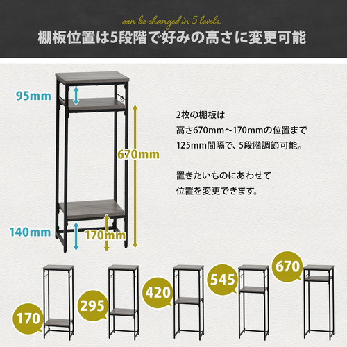棚を上部に付けてコンソールテーブル、棚を下に付けてオープンシェルフに。棚板位置は5段階でオリジナルスタイルに変更可能。