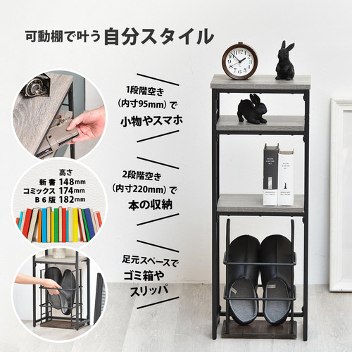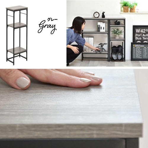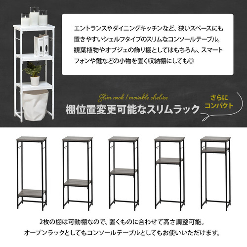 棚を上部に付けてコンソールテーブル、棚を下に付けてオープンシェルフに。棚板位置は5段階でオリジナルスタイルに変更可能。