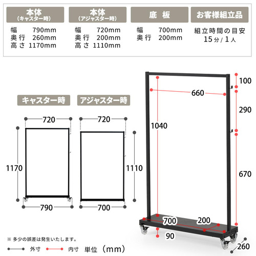 耐荷重:棚板:約10kg ハンガーバー:15kg=全体約25kg