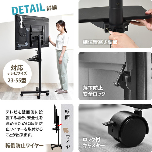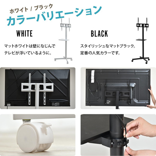 素材:【支柱】スチール(エポキシ粉体塗装) 【棚板】中質繊維板(メラミン貼り) 【対応テレビ】23-55型 【対応VESA】100×100〜400×400mm