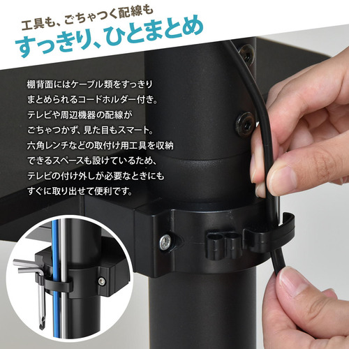 棚背面にはケーブル類をすっきりまとめられるコードホルダー付き。
