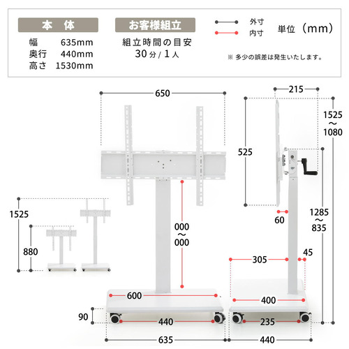 素材:【支柱】スチール(エポ機粉体塗装) 【底板】中質繊維板(メラミン貼り) 【対応テレビ】42-65型 【対応VESA】100×100〜600×400mm
