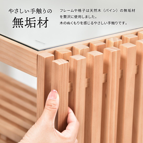 天板はパインの天然木をフレームにした5mmの強化ガラス。透明度が高く安全性の高いガラスを使用。