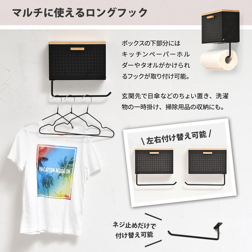 キッチンペーパーはもちろん、洗濯ハンガーの収納場所として使用したり、お出かけ用の帽子や鍵などを引っ掛けておくという使い方もできます。