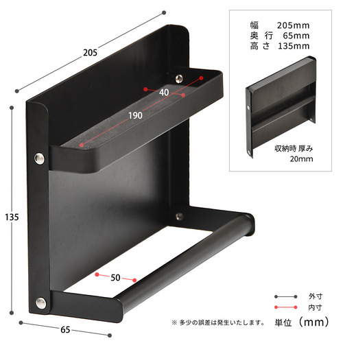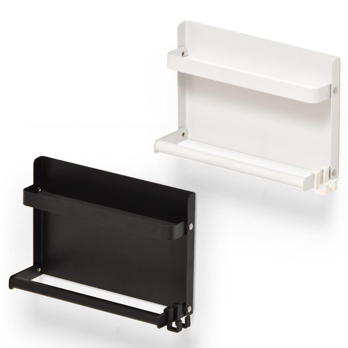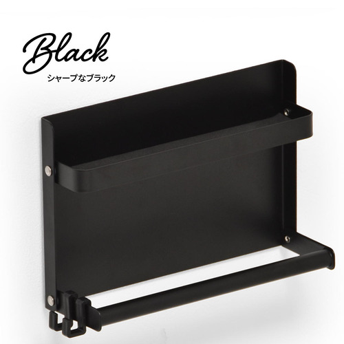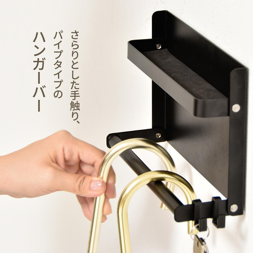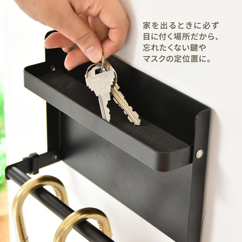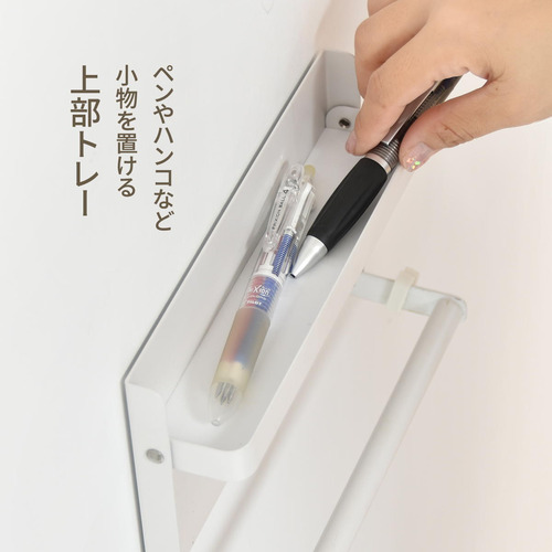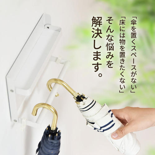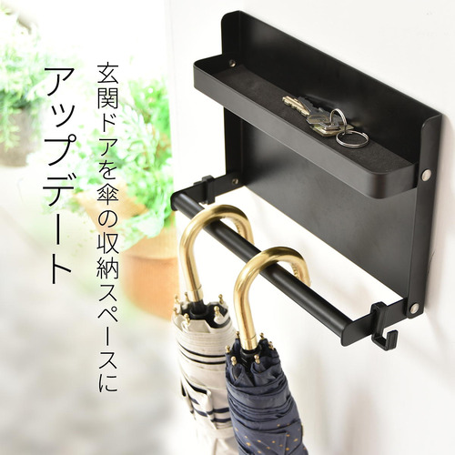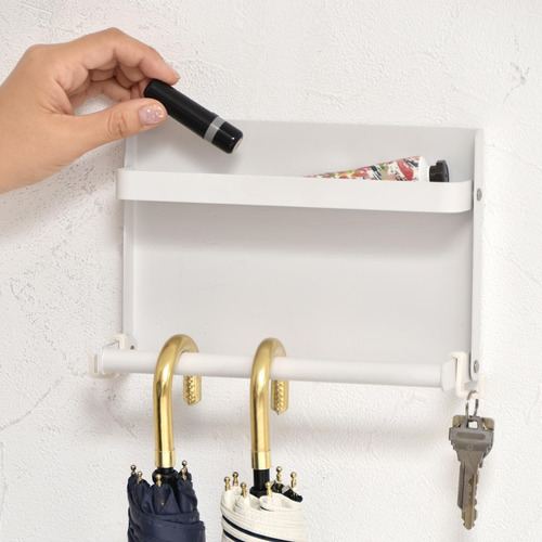 マグネットによる簡単設置で下部のハンガー棒に傘を引っ掛けて収納、上部にはトレーを備えています。