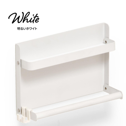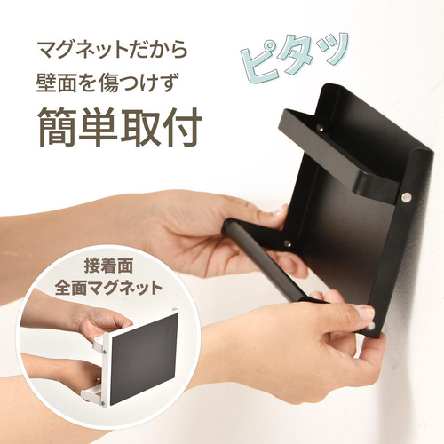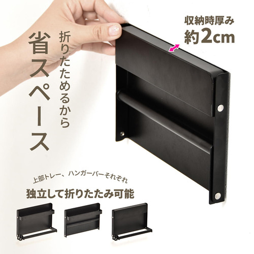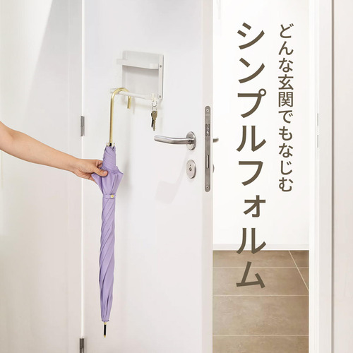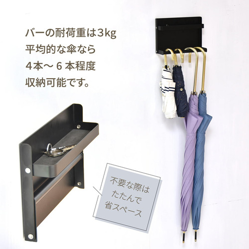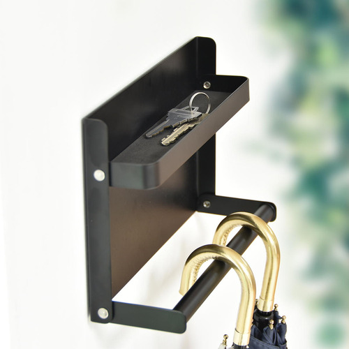 マグネットによる簡単設置で下部のハンガー棒に傘を引っ掛けて収納、上部にはトレーを備えています。