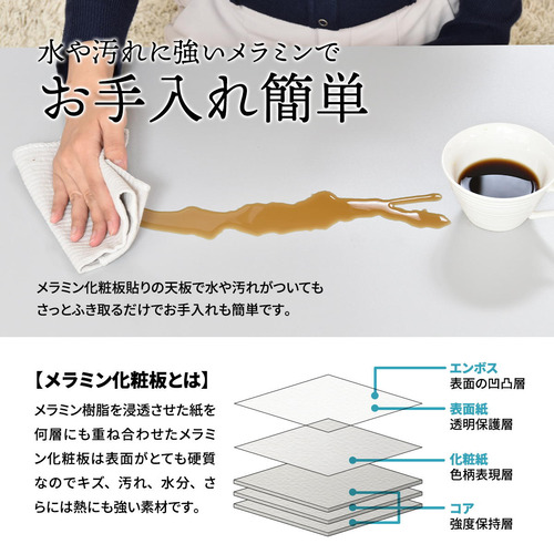 メラミン天板だから、汚れや水濡れにも強く、様々なシーンで対応可能です。