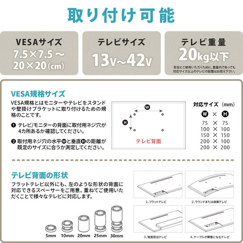 素材:スチール(粉体塗装) 【対応テレビ】13-42型 【対応VESA】75×75mm〜200×200mm
