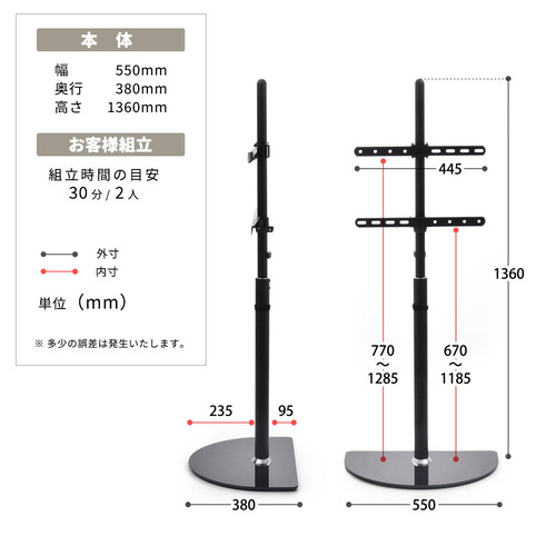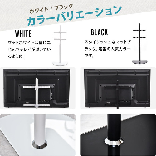 素材:【支柱】スチール(粉体塗装) 【底板】8mm強化ガラス 【対応テレビ】32-65型 【対応VESA】100×100mm〜400×400mm