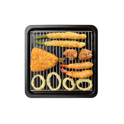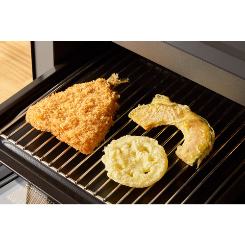 従来のレンジやトースターではうまく仕上がらなかった揚げ物を、外サクサク中まであつあつに仕上げる「リフライモード」搭載。レンジですばやく中まで加熱した食材を、上からの熱風で包み込んであたためるので、網の隙間から油が落ち、揚げたてよりもカラッと軽い食感に。種類の違う揚げ物の同時調理もできて、さらに時間と手間を節約できます。