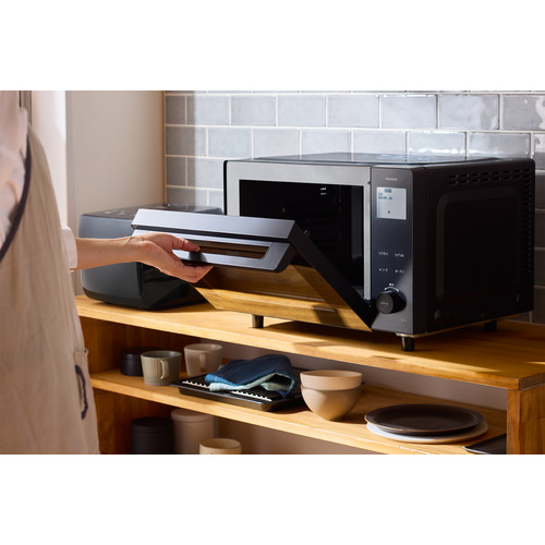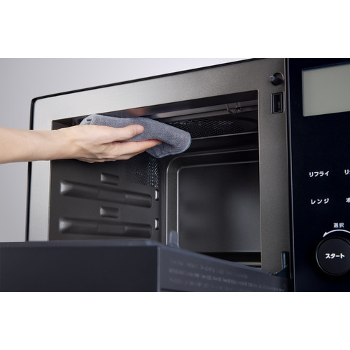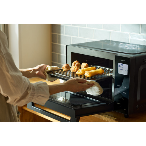 レンジとオーブンを自動で切り替えて食材をおいしくあたため直す「リフライモード」と「リグリルモード」では、レンジ加熱後にコンベクションファンの熱風で揚げ物や焼き物を包み込み加熱します。上面にあるファンが、食材に上方向から熱風を当て、余分な水分や油分を効率よく落とします。また、食材を網に乗せることで、上からの熱風が食材の下側まで包み込み、網の間から油も落ちるので、食材を裏返すことなく両面カリッと軽い食感に仕上げます。付属の天板と網はレンジ加熱に対応しているため、レンジからオーブンへのオート切り替え運転時にも問題なく使えて、皿から天板への移し替えの手間がかかりません。