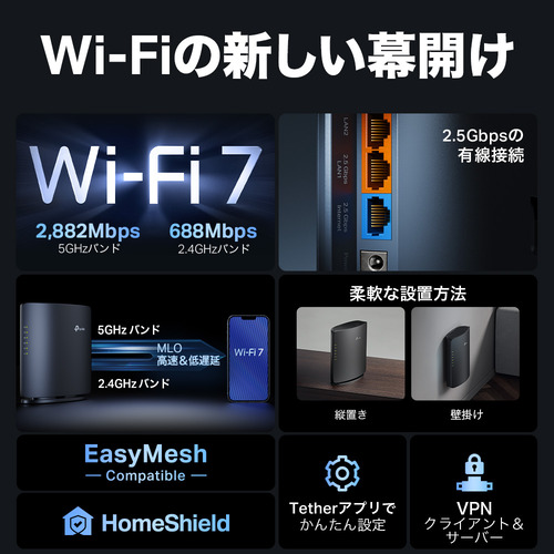 .5Gbps WANポート×1・2.5Gbps LANポート×1・1Gbps LANポート×3を搭載しており、高速な有線接続も可能