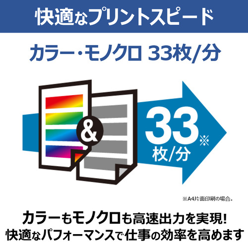 プリント速度:モノクロ【A4:33枚/分】カラー【A4:33枚/分】両面印刷【A4(2ページ:両面表裏1枚)29ページ/分】