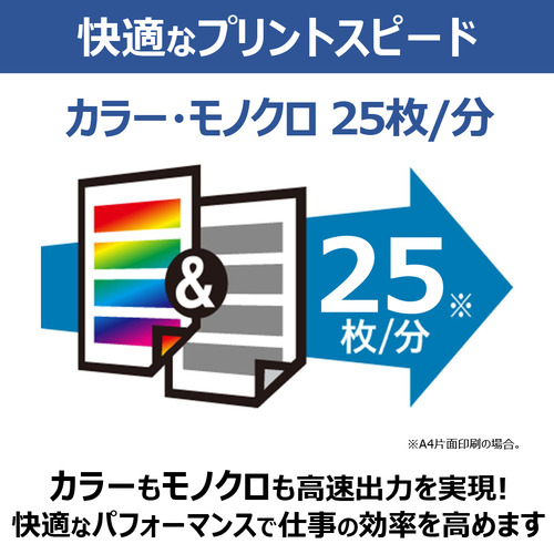 プリント速度:モノクロ【A4:25枚/分】カラー【A4:25枚/分】両面印刷【A4(2ページ:両面表裏1枚)15ページ/分】