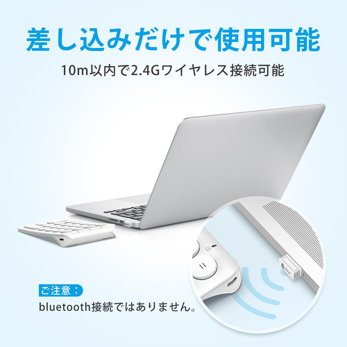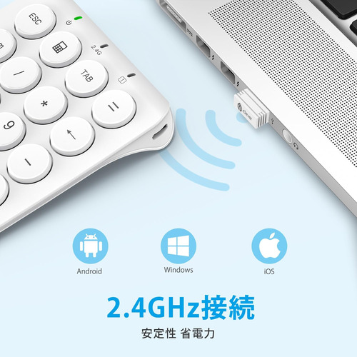 最大10mの転送距離でも、安定した通信で快適に操作できる2.4GHzのワイヤレステンキーです。本製品はtabなどのキーを搭載しているため、Excelやスプレッドシートなどを使用する際、格段に作業効率が上がります。