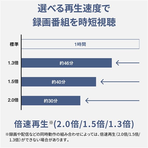 内蔵HDD録画時間:DR(地上デジタル/HD放送:17Mbps):約244時間、DR(BSデジタル/HD放送:24Mbps):約175時間、DR(BSデジタル/SD放送:12Mbps):約341時間、3倍録:約499時間、5倍録:約792時間、10倍録:約1416時間、15倍録:約1920時間