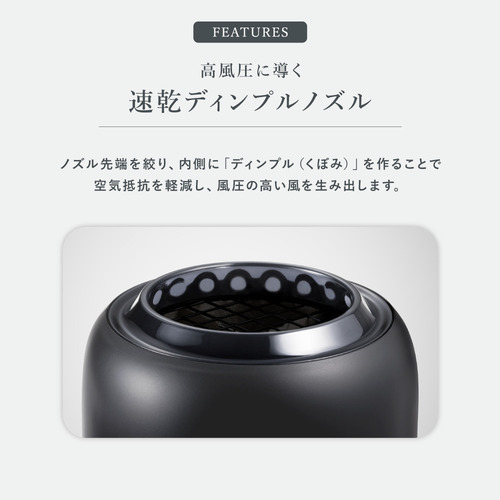 高風圧に導く「速乾ディンプルノズル」×自然から着想した「アマツバメファン」を搭載。コンパクトなボディでも風量4.8m3/分(※)を実現。高風圧に導く先端形状と空気抵抗を軽減する「ディンプル(くぼみ)」形状に加え、水平飛行で鳥類最速のアマツバメに倣ったファン形状で、効率よくパワフルな風を生み出します。※IEC規格に準拠