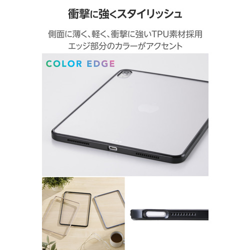 ●エッジ部分のカラーがアクセントとなる軽く、衝撃に強いクリアケースです。側面に弾力性のあるTPU素材を、背面に指紋が付きにくいポリカーボネート素材を使用しました。