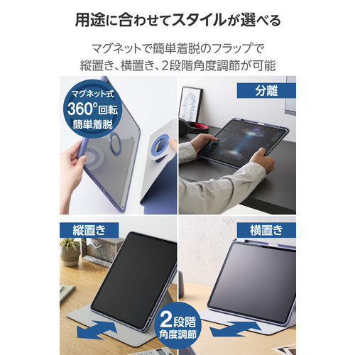 ●360度回転でき、縦向き、横向きのお好きな角度で使用できる、マグネット着脱フラップケースです。