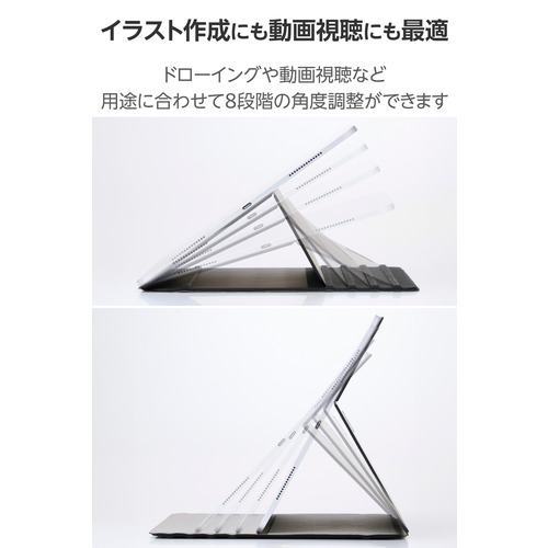 ●背面ケースを折り曲げて端末装着部を支えることで、動画視聴やタイピング、ドローイングなどのシーンに合わせて8段階の角度調整が可能です。