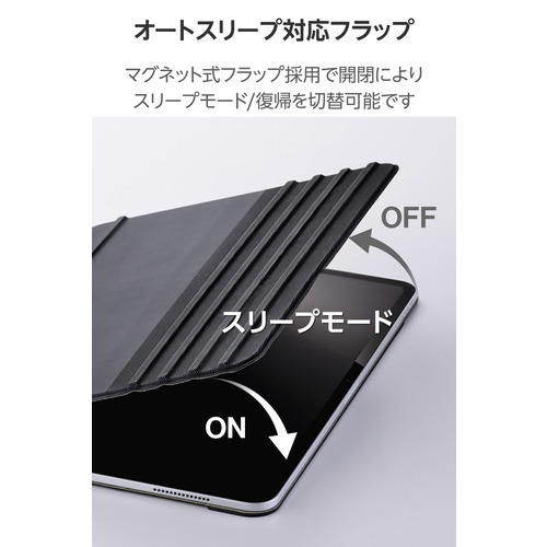 ●持ち歩き時に画面を保護するフラップ付きです。フラップを閉じるとスリープモードになり、開けるとスリープから復帰します。