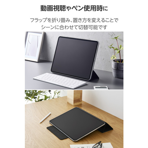 ●フラップカバーを三つ折りにすることで、動画視聴と、ドローイング・タイピングに最適な2通りの角度で使用できます。