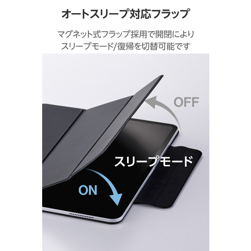 ●持ち歩き時に画面を保護するフラップ付きです。フラップを閉じるとスリープモードになり、開けるとスリープから復帰します。