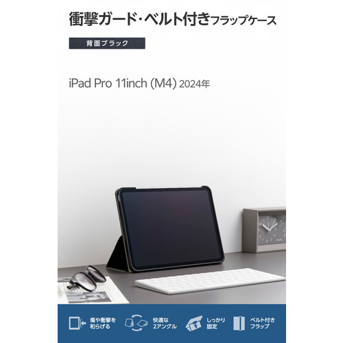 エレコム TB-A25PMPLF2BK iPad Pro ケース 11インチ ( M4 ) ベルト付きフラップ カバー 2アングル スタンド 軽量 耐衝撃 ブラック