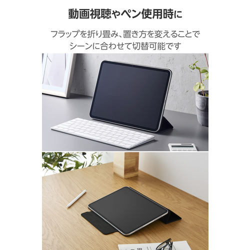 ●フラップカバーを三つ折りにすることで、動画視聴と、ドローイング・タイピングに最適な2通りの角度で使用できます。
