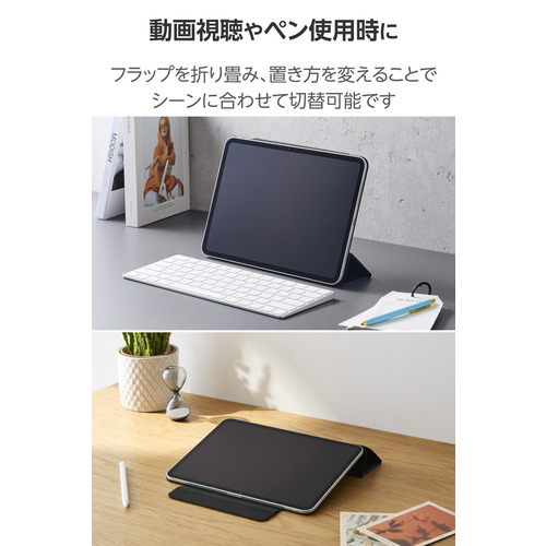 ●フラップカバーを三つ折りにすることで、動画視聴と、ドローイング・タイピングに最適な2通りの角度で使用できます。