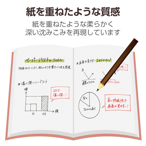 ●画面を傷や汚れから守る、指紋防止、反射防止タイプの紙心地フィルムです。特殊構造により、適度なペンの沈み込みを実感できる「文字を書く」ことにこだわった画面保護フィルムです。