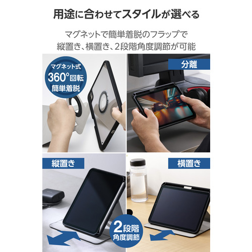●360度回転でき、縦向き、横向きのお好きな角度で使用できる、マグネット着脱フラップケースです。