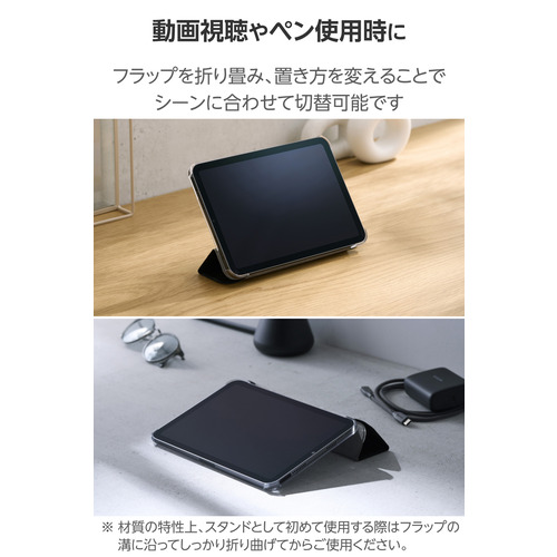 ●※開封後スタンドとして初めて使用する際は、フラップの溝に沿ってしっかり折り曲げてからご使用ください。材質の特性上、タブレットを立てにくい場合があります。