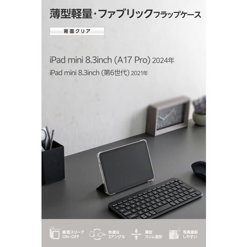 ●どんなシーンにも使いやすいファブリック生地を採用!軽さを重視する人におすすめの極限まで薄さにこだわったフラップケースです。シーンに合わせて2アングルにできます。端末の背面が見えるクリア素材を採用しています。