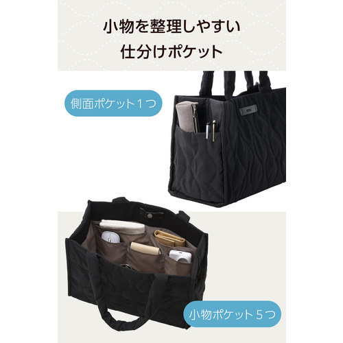 ●在宅ワークの道具管理や社内移動もスムーズにできる!ハンドル付きのツールボックスです。大容量設計で、資料やワークツールをまとめてすっきり収納可能。上品な光沢のあるオニオンステッチのキルティング素材を採用した、大人カジュアルなデザインです。