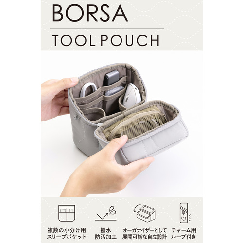 ●デスク周りの小物やガジェット、筆記用具などのワークツールをまとめてスッキリ収納!デスク上で道具入れとして使える、スタンドタイプのツールポーチです。上品な光沢のあるオニオンステッチのキルティング素材を採用した、大人カジュアルなデザインです。