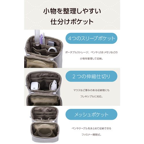 ●ポータブルストレージ、ぺンやUSBメモリなどの小物を整理して収納できる4つのスリーブポケットを備えています。