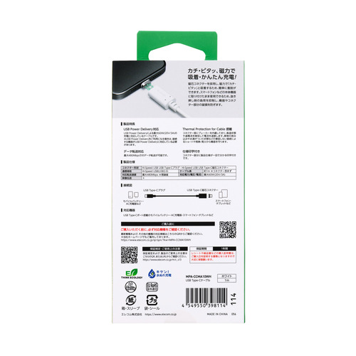 エレコム MPA-CCMA10WH マグネット 充電ケーブル USB-C 60W PD対応 着脱式コネクタ ブレーカー内蔵 1m ホワイト