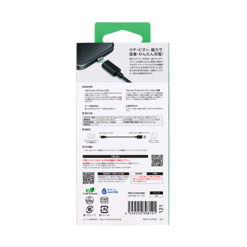 エレコム MPA-CCMA20BK マグネット 充電ケーブル USB-C 60W PD対応 着脱式コネクタ ブレーカー内蔵 2m ブラック