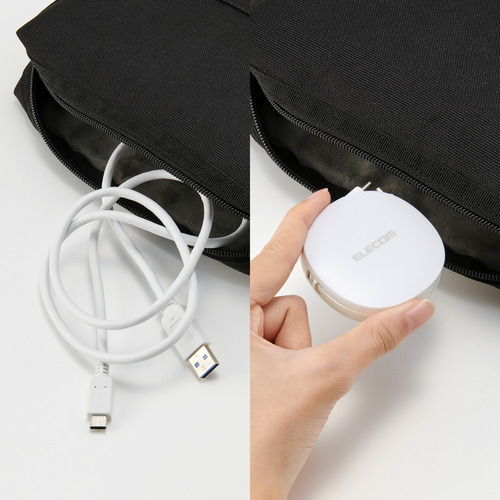●シュルッと収納、絡まずすっきり。約90cmのケーブルがコンパクトにまとまる、巻き取り式のUSB Type-C(TM) - USB Type-Cケーブルです。手のひらサイズのケースで、持ち運びに便利。片手で引っ張って使える片側巻き取り式です。