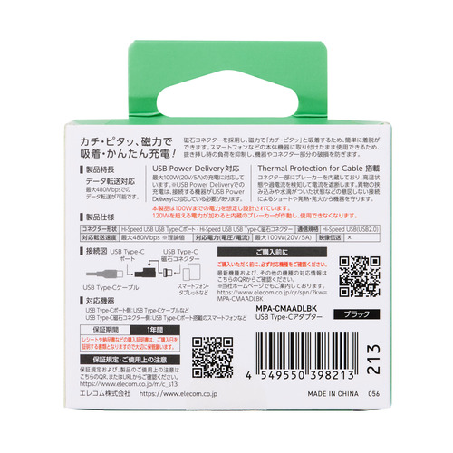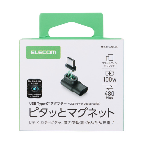 エレコム MPA-CMAADLBK USB-C マグネット 変換アダプタ L字型 100W PD対応 着脱式コネクタ ブレーカー内蔵 ブラック